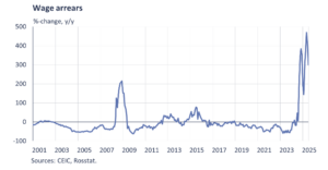 Wage pressures are particularly acute in sectors favoured by the state, which push up compensation and distort labour allocation across the economy. Firms in sectors not included in state procurement supply chains are unable to compete with military-related sectors with high wages, as companies’ own finances have deteriorated during 2025. As economic activity cooled in 2025, several negative signals emerged, including reports of growing wage arrears (see graph above) and increased part-time work and labour shortages. Part-time work and salary cuts are traditionally important adjustment mechanisms in the Russian labour market rather than outright layoffs.
